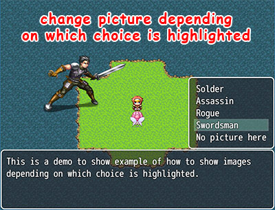 This plugin allows you to display the ‘Show Choices’ selection in a more visual novel style layout and using a graphic for the background and hover state.
